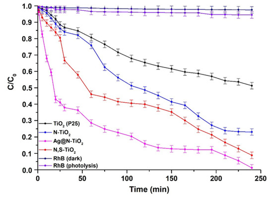 The efficiency of the photocatalytic activity of the synthesized chemically modified TiO2 powders under visible light irradiation was evaluated using 0.005 g of each powder (N-doped TiO2, N,S-codoped TiO2, and Ag-loaded N-doped TiO2) in 10 mg/L Rhodamine B (RhB) aqueous solution (250 mL) at 25 °C and pH = 6.65 ± 0.01. Prior to each photocatalytic experiment (cycle), extra pure O2 (99.999%) was vented through the RhB solution for 1h, in order to saturate it.