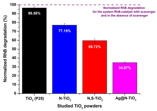 2.5. Photocatalytic Activity of the Chemically Modified TiO2 Powders