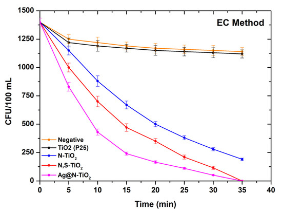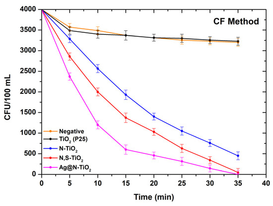 Advanced oxidation processes (AOPs) have been identified as a technology that could be used in the disinfection phase of wastewater treatment plants [3,26,27,28]. Several materials have been explored as photocatalysts for such applications, like hexaferrites and MOFs, presenting highly satisfactory results [29,30,31]. However, TiO2 has received great attention in recent years [3,32,33,34], as it is well established that when photons from a light source interact with the surface of a TiO2 particle, electrons can be excited from the valance to conduction band, leaving behind positively charged holes. The electrons react with molecular oxygen and the positive holes with water molecules so various types of reactive oxygen species (ROS) are formed and kill bacteria [35,36]. Some previous research efforts have evaluated the photocatalytic performance of TiO2 photocatalysts (pure or chemically doped) by testing the bacteria disinfection rates when a photocatalyst reacts with standard solutions of bacteria contained in small containers (e.g., tubes, vials) under visible light irradiation [37,38].