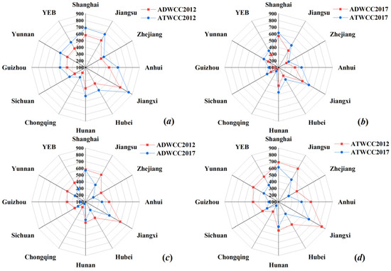 - The spatial correlation network has formed several network centers, such as Zhejiang, Chongqing and Jiangsu, which has played an important role in the formation of the spatial correlation network and has an impact and control on ATWCC in the 11 provinces (cities); In terms of cluster structure characteristics, YEB has obvious regional characteristics. Especially in 2017, the division between the upper, middle and lower reaches and the three plates has been basically continuous. Zhejiang and Jiangsu in the eastern coastal area are the main destinations of the spatial spillover of the spatial correlation network.