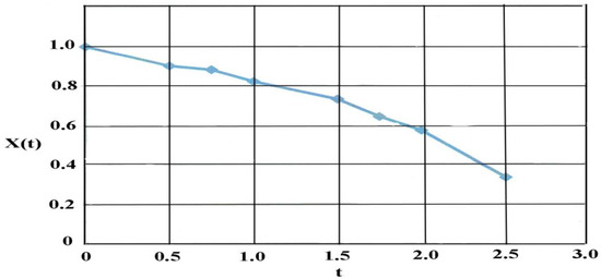 At t = 0, the initial condition Xα(0) is recovered on both sides of Equation (5). The Xα(t) population consists of the ruling class of society; the Xβ population is the nonsecular working trade class segment, with both classes sharing a similar fate, as climate conditions affecting agricultural production led to population decline. The solution shown in Figure 1 from Equation (5) indicates the decline of the Xα(t) ruling over time for k and K values representing 10th–11th CE century extended drought conditions. The governing leadership class Xα(t) segment diminishes in a damaging way as the disappearance of leadership elites disassembles guidance figures directing the fate of the population. Rituals and celebratory ceremonies were no longer performed, and trust in leadership’s authority was compromised.