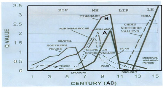 Drought led to societal decline for both the Tiwanaku and Wari polities as well as influencing the Peruvian north coast Moche, Sican and Chimú Societies (Ortloff and Moseley 2009). The Q Value ordinate denotes the survivability value of a civilization as defined in [18].