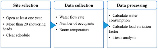 Three main research steps were involved in this study. As shown in Figure 1, a swimming pool with public showering facilities was first selected. Then, the water flow rate was measured on-site in the chosen swimming pool. At last, the collected data were analyzed to understand the water demand patterns and water consumption of the investigated showering facilities. The following subsections provide detailed information about each of these stages.
