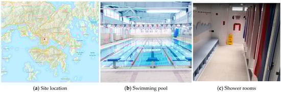 To identify a clear and representative water consumption pattern during showering in public swimming pools, the following criteria were applied when selecting the investigation sample: (ⅰ) open at least for one year; (ⅱ) have more than 20 showering heads; and (ⅲ) have a clear available schedule. Accordingly, a swimming pool showering facility in Hong Kong, China was selected as the case investigated in the current study (see Figure 2).