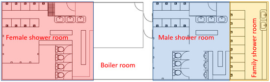 The swimming pool was only open for conducting swimming lessons, and the opening hours were from 16:30 to 19:30. Two one-hour classes were held every weekday from 17:00 to 18:00 and from 18:00 to 19:00. The swimming pool showering facility had three rooms for male, female, and family users, accounting for 25 shower heads (see Figure 3). The water was directly supplied from the public main to the water facilities in the swimming pool.