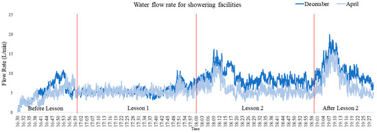 In total, 27 people, including 3 instructors and 24 students (12 for each lesson), used the showering facilities during the measurements in both seasons. Figure 4 shows the water flow rates in the main water supply pipe of the showering facilities in the investigated swimming pool. As can be seen, the water flow rate was higher in December than in April. The difference was evident in the periods after Lesson 1 (during Lesson 2) and after Lesson 2, as students were taking showers during that time. In contrast, almost no difference in the water flow rate can be identified between these two months during Lesson 1, and the water flow rate remained stable (about 5 L/min) during this period. This is caused by the water curtain located at the swimming pool’s entrance, where chlorinated water continuously flows down at a fixed rate during the opening hour of the swimming pool. All swimmers must pass through it before going to the swimming pool to protect the water quality.