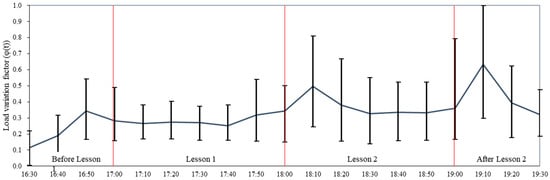 As shown in Table 1, although there were considerable differences in the water supply flow rate between the two seasons, the change patterns were the same, namely, the peak periods always occurred after the swimming lessons between 18:00 and 18:20 and between 19:00 and 19:20. To better understand the water demand pattern, the load variation factor of the instantaneous water flow rate measured in both seasons in the main supply pipe for showering facilities was calculated for every 10 min using Equation (2), as illustrated in Figure 5. The maximum water load variation factor was 1 (corresponding to 19.98 L/min water flow rate), which occurred at 19:07 after the end of the second lesson in December.