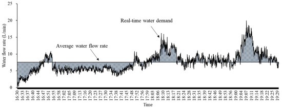To ensure the water supply during peak periods, the water supply system and the water pump had to be designed based on the maximum demand, which caused the pump to work at a low efficiency most of the time. For instance, the average water flow rate in the investigated shower rooms was 7.57 L/min in December (represented by a straight line in Figure 7). However, the maximum water flow rate was 19.98 L/min, which was more than twice the average level. If a water storage tank is installed, an average water supply rate can be maintained. Under this circumstance, as shown in Figure 7, the water will be stored in the tank when the water demand is lower than the average level (the shadow below the average line). This stored water will be conveyed to the users, together with the water coming from the main supply pipe, will be conveyed to the users when the demand exceeds the average level.