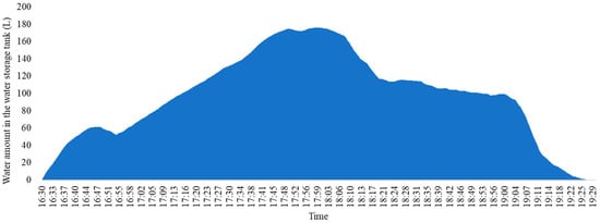 Figure 8 illustrates the variation in the amount of water in the tank with time for a scenario in which no water is stored in the tank before the opening hour (i.e., 16:30). The water outflow rate from the tank is lower than the water inflow rate during the initial period. Hence, the extra water inflow is stored in the tank and accumulates with time until the peak (after 18:00) to the full-tank capacity of 176 L. During the peak period, the water outflow rate is higher than the water inflow rate. Therefore, extra water outflows from the tank, and the in-tank water amount decreases with time. The water supply system and the pump operate stably in this case. The system demands are equally distributed throughout this period.