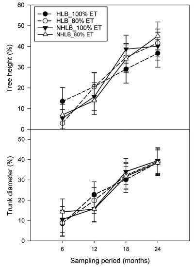 Percent change in tree height and trunk diameter on huanglongbing (HLB)-affected and non-HLB-affected (NHLB) “cv. Valencia” trees at two evapotranspiration (ET)-based irrigation rates (100% and 80% ET) from 2019 to 2021. The percentage change referred to the change between the baseline measurement and the sampling period (monthly) measurements.