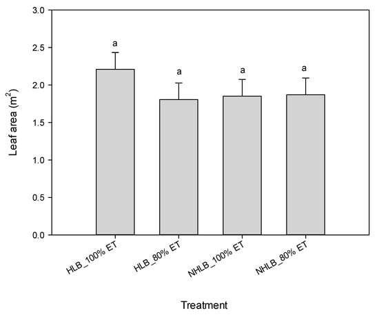 The tree height was significantly different (p = 0.009) for both years between treatments. In year one, HLB-affected trees subjected to 100% ET had 5–8% greater height than NHLB trees at 100% and 80% ET, respectively (Figure 1). However, between the HLB-affected trees, there were no significant differences in tree height for 100% or 80% ET. In the second year, NHLB trees subjected to 80% ET had a 5–7% increase in height as compared to HLB-affected trees that were irrigated at 80% and 100% ET (Figure 1). The results on height between the HLB-affected trees were comparable. The HLB-affected trees at both 100% ET and 80% ET had at least a 5% increase in trunk diameter compared to the NHLB-affected trees at 100% ET and 80% ET (Figure 1) at the end of year one. In the second year, the changes observed in trunk diameter were comparable for all trees, irrespective of their HLB status or irrigation rate. The leaf area at the end of the second year was not significantly different among all treatments (Figure 2).