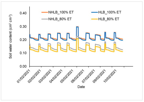 Soil moisture content data at 15 cm depth in the irrigated zone of huanglongbing (HLB)-affected and non-HLB-affected (NHLB) “cv. Valencia” trees under two evapotranspiration (ET)-based irrigation rates (100% and 80% ET) on 1 February to 15 February, 2021.