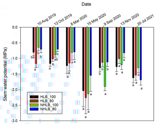 Effect of stem water potential (MPa) on huanglongbing (HLB)-affected and non-HLB-affected (NHLB) “cv. Valencia” trees under two evapotranspiration (ET)-based irrigation rates (100% and 80% ET) from 2019 to 2020. Means within a measurement date followed by the same letter are not significantly different at α = 0.05 (Tukey post hoc tests, p ≤ 0.05).