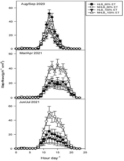 Maximum sap flow occurred between 11 and 16 h for HLB-affected trees during the three measurement periods (Figure 5). This suggests that water availability at this time has a greater chance of being taken up by the plant. Some authors reported similar sap flow patterns in their studies on citrus irrigation scheduling [,]. For example, the work by [] reported that irrigation events between 9 h and 18 h should result in increased water uptake. This means that an irrigation schedule after 16 h and before 7 h may result in low water uptake for citrus production.