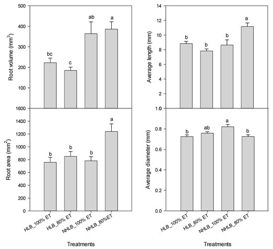 The root growth was significantly different among treatments. The total root volume and area ranged between 175 and 491 mm3 and 795 and 1253 m2, respectively (Figure 6). The root volume for NHLB trees at 80% ET was 50–60% greater than that of HLB-affected trees at 100% and 80% ET, respectively (Figure 6). The HLB-affected trees irrigated at 100% ET showed a 25% greater root volume than those irrigated at 80% ET. Considering root length and area, HLB-affected trees irrigated at 100% ET had at least 20% greater values than those irrigated at 80% ET (Figure 6).