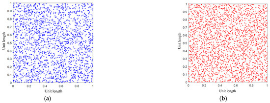 Figure 1a,b show the two-dimensional distribution of the pseudo-random sequence and Sobol sequence sampled 2000 times in the range of 0 to 1, respectively. It can be seen that the sampling points of the pseudo-random sequence are prone to local clustering, while the Sobol sequence has better uniformity than the pseudo-random sequence.