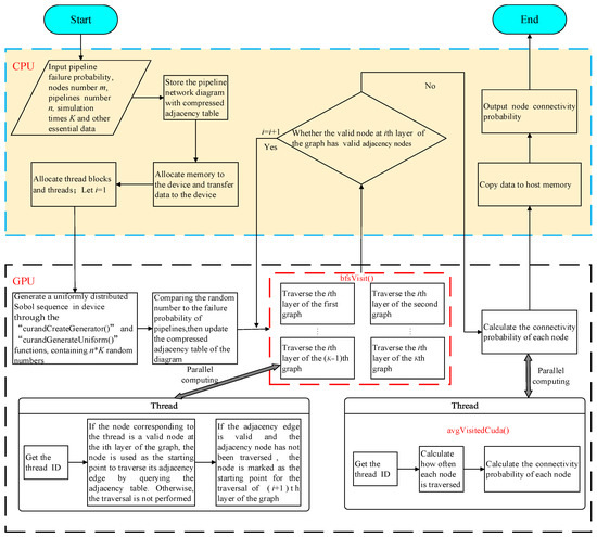 With the rapid advance of the Graphics Processing Unit (GPU) [35] and the advent of Computer Unified Device Architecture (CUDA) [36], GPU parallel computing technology based on the CUDA platform has been widely used. CUDA is a parallel computing platform and programming model developed by NVIDIA for general-purpose computing graphics processing units. Developers can take advantage of the powerful parallel computing engine of graphic processing units (GPUs) to speed up their programs through CUDA. In GPU-accelerated applications, the computationally complex and logically strong part runs on the Central Processing Units (CPU), while the computationally intensive, logically simple, and data-decoupling part is processed on the GPU. Since the results produced by the random simulation method are independent each time, it has natural parallelism and is very suitable for parallel computing. Some scholars have carried out parallel research on simulation methods using GPU technology in their respective fields and achieved good acceleration effects [37,38,39,40]. Therefore, GPU technology can also be applied to SCR analysis of WDS.