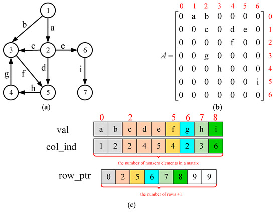 Storage form of directed edge-weighted graph. (a) Directed edge-weighted graph. (b) Adjacent matrix. (c) Compressed row storage.