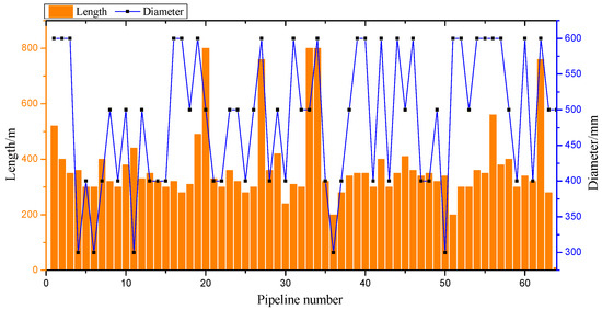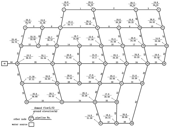 To verify the applicability of the parallel method in this paper, a WDS is taken as an example to analyse its SCR, and the layout of the WDS is shown in Figure 4, which consists of 40 nodes and 64 pipelines. The water supply source is node 40, whose water level is constant at 60 m. The demand flow rate and ground elevation of other nodes can also be seen in Figure 4. Ductile cast iron pipes are adopted in this WDS, and information on pipeline length and diameter is shown in Figure 5. To obtain the probability of different failure states of the pipeline, three kinds of analysis methods are generally adopted, including empirical methods, expert judgment methods and analytic methods. In this study, an empirical method is adopted, and its core idea is to obtain the pipe repair rate (RR) considering pipe type, pipe diameter, site conditions, soil characteristics and other factors by statistical regression of historical earthquake damage data. Furthermore, assuming that the pipeline seismic damage occurs randomly and independently along the pipeline and follows the Poisson distribution, the failure probability Pd of the pipeline can be expressed as follows: