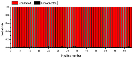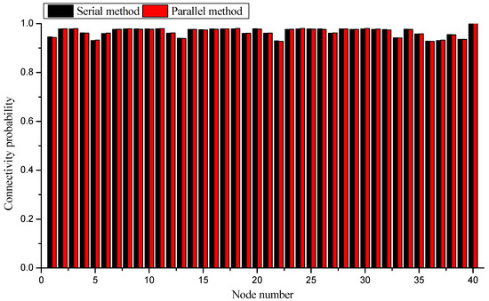 Based on Equations (14)–(16), the failure probabilities of the pipelines under the action of a 9-degree earthquake (0.4 g) are shown in Figure 6. Then the parallel algorithm proposed in Section 4 is used to analyse the SCR of the WDS and compare the results with the traditional serial simulation method based on the Monte Carlo method. It should be noted that both the traditional serial algorithm and the parallel algorithm in this article are implemented in the Visual Studio platform using the C++ programming language. The parallel algorithm is implemented based on the Nvidia CUDA5.0 development kit, and the operating environment is Windows 7. A 2.20-GHz Inter(R)Xeon(R)E5-2407 processor with 4 GB memory and an NVIDIA GeForce GT 610 with 2 GB graphics memory are employed. To verify the accuracy of the parallel method, the serial program and parallel program developed by the author were used to perform 1,000,000 simulations to calculate the seismic connection probability between each node of the pipeline network and the water source under the action of a 9-degree earthquake. As shown in Figure 7, the calculation results of the two methods are basically consistent, and the maximum error is 0.2%, which shows that the parallel method in this paper is correct and meets the accuracy requirements.