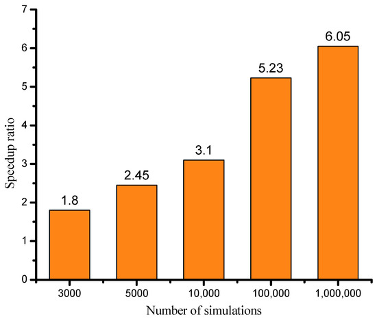To test the computational efficiency of the parallel method in this study, the serial program and the parallel program are used to simulate 3000 times, 5000 times, 10,000 times, 100,000 times, and 1,000,000 times. The simulation times and speedup ratios of the two methods are shown in Table 2 and Figure 8, respectively. It can be seen that with the increase in the number of simulations, the program calculation time and speedup ratio of the two methods increase accordingly. When simulating 1,000,000 times, the parallel method can obtain a 6-fold speedup over the serial method, and shorten the calculation time by 11 s, which shows that the parallel method is helpful to improve the efficiency of the SCR analysis of the pipeline network.