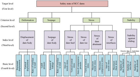 According to the principles of building the indicator system, i.e., scientific and operational, clearly prior and relatively independent, qualitative and quantitative, and reasonably hierarchical indicators were determined. As RCC dams are constructed in layers, the interface gap between adjacent layers is larger than in traditional concrete dams. This gap generates a certain pressure at the interface when compressing the cement concrete, creating an interface effect. The interface effect is mainly reflected in several aspects: stress concentration, interface exchange, and overall deformation. Therefore, in addition to the traditional dam evaluation items, the corresponding interface stresses, displacements, and other interface characteristics should be considered. We built the evaluation indicator system shown in Figure 1. The first level is the target level reflecting the safety state of the RCC dam. The second level is the criterion level, including the deformation, seepage, stress, and stability state of an RCC dam. The third level is the indicator level constituted by the displacement of the dam body, the seepage of the dam body, the stress of the dam heel, the stress of the dam toe, the stress of the dam abutment, the stress of the interfaces, and stability against sliding. The fourth level is the basic level, including horizontal displacement, vertical displacement, the ratio of the interface displacement to the total displacement, uplift pressure, quantity of leakage, ratio of the interface leakage to the total leakage, range of tensile stress, the normal vertical stress, the range of compressive stress, the maximum tensile stress, the maximum compressive stress, the maximum shear stress, stability against sliding of the dam foundation, stability against sliding of the interface, etc.