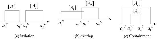 where is the maximum interval, is the minimum interval, means the lower boundary of an interval, and means the upper bound. The maximum interval and the minimum interval are obtained by interval sequencing based on the possibility degree theory. Let and . The relationship between and can be