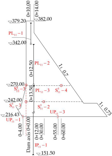 The orthographic perpendicular lines and inverted perpendicular lines are placed in the dam body to monitor the dam deformation. Osmometers monitor dam osmotic pressure; stress and strain gauge groups monitor dam stress. Dam stability is obtained by stability analysis using the finite element method. Taking the typical block 11#, for example, its monitoring system (see Figure 5) consists of osmometers UP11-1 and UP11-3; inverted perpendicular line IP11, orthographic perpendicular lines PL11-3, PL11-2, and PL11-1; groups of stress and strain gauges S511-1, S511-2, S511-3, and S511-4.