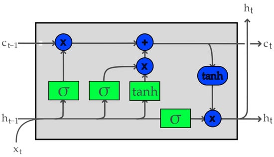 As shown in Figure 1, Long Short-Term Memory (LSTM) [2] neural networks maintain and transmit a cell state across various layers, permeating the entire recurrent network architecture and employing specifically designed “gate” structures that determine the updating and modification of cell states through elementary linear operations, which optimizes the propagation of gradients in the backpropagation (BP) process. Consequently, they selectively rectify parameters returned by the error function during gradient descent to preserve long-term dependencies and discard irrelevant information, thereby mitigating, to a certain extent, the issues of gradient explosion and vanishing gradients. For each input time sequence, each layer of the LSTM neural network encompasses the following functions [28]. The symbols in Figure 1 are the same as in the formula:
