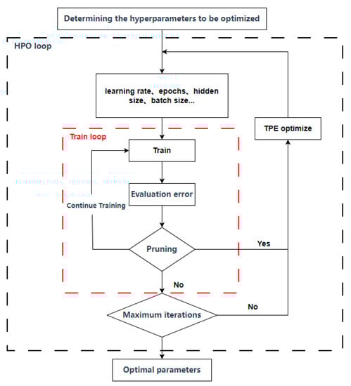 • TPE-HPO: Establish corresponding LSTM neural network models ( N t , N s , and N r ) for the trend, seasonal, and residual components, and use the TPE algorithm to optimize the hyperparameter values of the models, selecting the best model. The hyperparameter optimization is represented by the flowchart in Figure 3, with train loop representing each epoch, and HPO loop denoting each trial. The train loop contains pruning operations, comparing model fitting accuracy within the same training iteration. If the accuracy is insufficient, the training terminates early, discarding unfruitful training attempts and improving HPO efficiency. TPE optimization determines the hyperparameter values for the next train loop using the TPE algorithm.