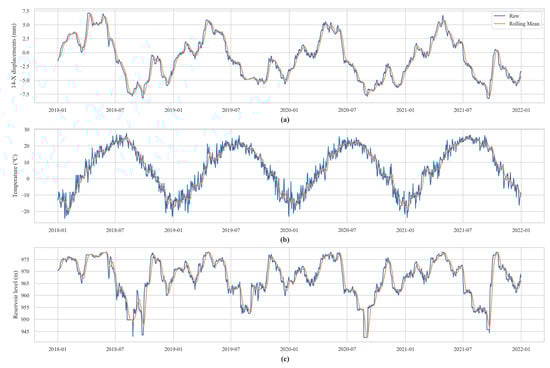 Figure 5. Measured data process line chart: Measured values are shown in blue, and moving averages are shown in orange. (a) Horizontal displacement of dam section #14. (b) The ambient temperature of the project site. (c) Water level of reservoir.