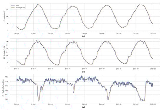 Figure 6. Measured data process line chart: Measured values are shown in blue, and moving averages are shown in orange. (a) Strain monitoring values at measuring point 14_3. (b) Strain monitoring values at measuring point 14_6. (c) The pressure-monitoring value of the dam foundation.