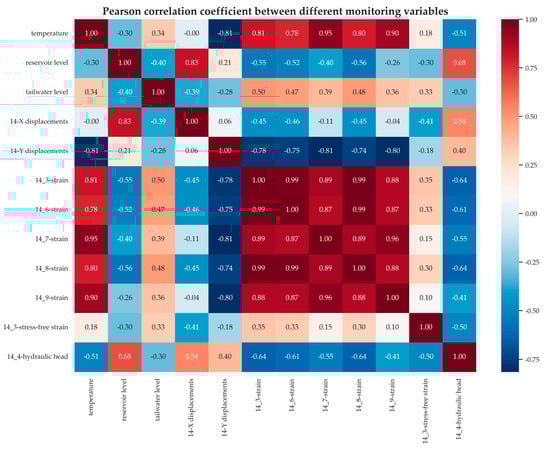 In the correlation heatmap, prefixes indicate the dam section where the instrument is located, X represents the along-stream (horizontal) direction, and Y denotes the vertical direction. As shown in Figure 7, reservoir water levels exhibit a distinct correlation with the along-stream displacement of the dam crest in section 14. Some internal monitoring instruments are significantly affected by temperature, displaying a strong positive correlation. This is mutually corroborated by the qualitative analysis of deformation and water level curves in the previous section, demonstrating the effectiveness of correlation analysis. In addition to environmental factors such as water level and temperature, this study also utilizes highly correlated strains from the same dam section as the original data for establishing a multi-dimensional LSTM model.