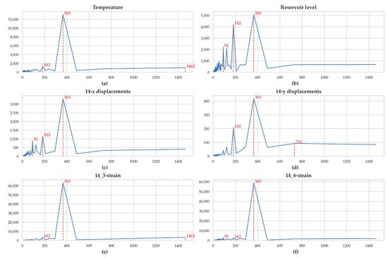 According to the spectral analysis, the autocorrelation coefficients for each optimal cycle are calculated using the autocorrelation function. Some calculation results of the measured sequences are shown in Table 1, where vertical displacement is taken from the 14-Y absolute displacement, and horizontal displacement is taken from the 14-X absolute displacement. The optimal cycles are concentrated around 365 and 182 days. The ACF value of temperature with a 182-day cycle is −0.7763, while the ACF value with a 365-day cycle is 0.6813. This result deviates from the optimal cycle obtained by Fourier decomposition, but considering practical experience, the decomposition cycle is still set to 365. Other data exhibit high consistency between the cycles characterized by discrete Fourier decomposition and the autocorrelation function, indicating that using the discrete Fourier decomposition method for cycle analysis is reliable.