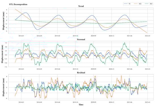Based on the cycle parameters obtained from cycle analysis, the measured values are decomposed using the STL method. Taking horizontal displacement data as an example, cycle parameters of 91, 182, and 365 days are chosen, and the decomposition results are shown in Figure 9. The cycle parameters significantly affect the STL decomposition results. As the cycle parameters approach the optimal cycle obtained from cycle analysis, the periodic fluctuations in the trend component are gradually attributed to the seasonal component, and the regularity of the residual component decreases accordingly. This demonstrates that the STL algorithm performs better at the optimal cycle than at other parameter values. The decomposition results show that the horizontal displacement of the concrete dam is mainly influenced by periodic environmental factors such as water level and temperature. The trend component of the displacement, which is affected by time-dependent factors and concrete creep, has stabilized, which is consistent with the performance characteristics of the dam’s stable operation for more than twenty years.