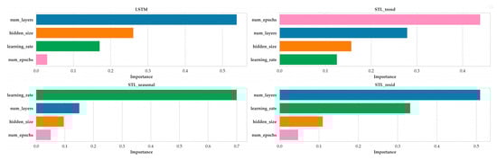 The relationships among these hyperparameters are complex, and Optuna’s hyperparameter optimization framework can conveniently implement database-based parallelism based on the TPE algorithm, greatly enhancing the efficiency of exploring the hyperparameter space. As a result, we can investigate the patterns among hyperparameters in many experimental samples. Figure 10 displays hyperparameter importance, showing the importance of each hyperparameter for the residual, periodic, and trend components after STL decomposition and for undecomposed original data when modeling directly.