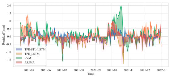Table 3 presents the monthly average values of the prediction results, actual measurements, and residuals of the four models. Figure 11 shows the residual area plots of each model. It can be seen from the graphs that the residuals of all four models exhibit positive and negative fluctuations, indicating that the predictions fluctuate above and below the actual measurements. However, the TPE-STL-LSTM model’s residual distribution is more even compared to the other three models. As time goes on, the positive and negative fluctuations in SVM and ARIMA residuals become larger. This verifies that the LSTM model can mine and learn the relationships between pieces of long-sequence information, thereby improving prediction accuracy.