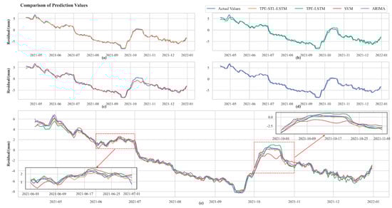 Figure 12. Comparison of different model forecasts: (a) TPE-STL-LSTM model; (b) TPE-LSTM model; (c) SVM model; (d) ARIMA model; (e) Comparison of all predicted values.