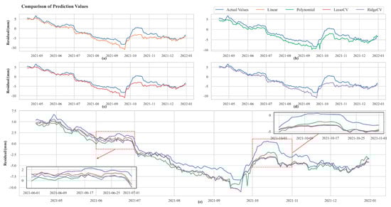 Figure 13. Comparison of different model forecasts based on regression: (a) Linear Regression Model; (b) Second-Order Polynomial Regression Model; (c) Lasso Regression Model; (d) Ridge Regression Model; (e) Comparison of all predicted values.