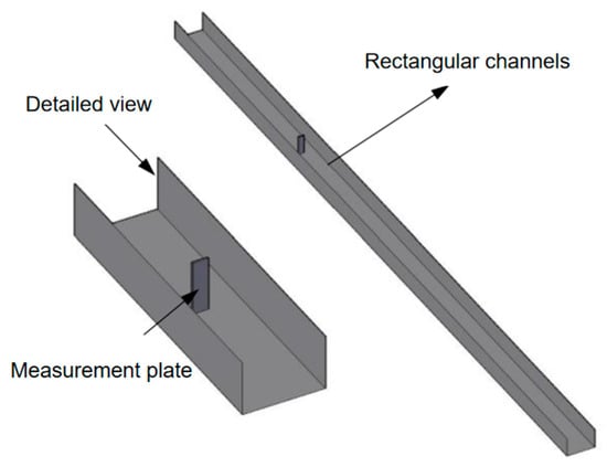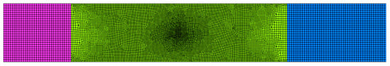 The model was imported into ICEM CFD to mesh the computational domain. In order to ensure calculation accuracy, improve the meshing quality, and minimize the calculation time, a minimum size of 2.5 mm and a maximum size of 10 mm were used for meshing the model. Because of the simple structure of the measurement plate and the rectangular channel, the structured mesh was used to divide the model. In the mesh division, considering that the area near the measurement plate is the main area of study, the mesh near the upstream and downstream was encrypted, and a mesh size of 2.5 mm was chosen, while the mesh in the area far from the measurement plate was chosen as 10 mm size. In order to ensure the two parts of the mesh are more smoothly connected, except for the mesh size near the plate surface that was 2.5 mm, the mesh size of other parts of the encrypted area was 5 mm. The total mesh number after mesh division was about 710,000, and the mesh division results are shown in Figure 4.