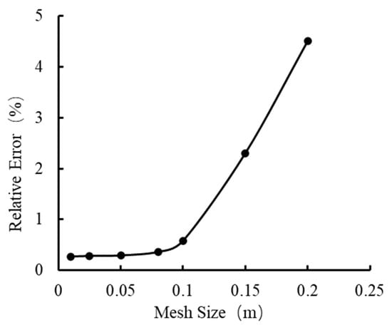 In the numerical calculation process, the size and number of grids affect the accuracy of the results. Therefore, the independence of the grid is checked by monitoring the changes in water level upstream and the velocity of the measuring plate under different grid sizes. We carried out a simulation for different mesh sizes of 20, 15, 10, 8, 5, 2.5 and 1.0 mm. The results are shown in Figure 3. It can be seen that the discrepancy between the simulation results for the mesh sizes of 1 and 10 mm is only 0.3%. We, therefore, conclude that mesh size is not the main factor affecting the simulation results at this time when there is a strong correspondence between the simulation results and the physical test results. Because a mesh size below 10 mm was suitable for the study purposes, this was the size selected for our simulation.