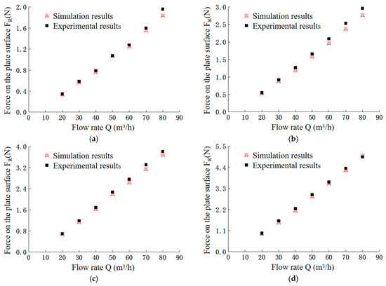 Comparison between the experimental and simulation results of the force on measurement plate surface: (a) B = 30 mm; (b) B = 40 mm; (c) B = 50 mm; (d) B = 60 mm.