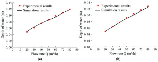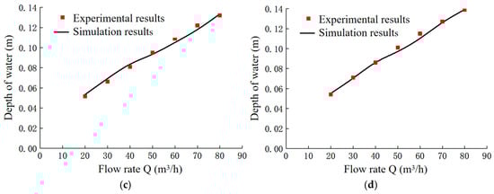 Comparison between the experimental and simulation results of average water depths at 0.2 m upstream of the measurement plate: (a) B = 30 mm; (b) B = 40 mm; (c) B = 50 mm; (d) B = 60 mm.