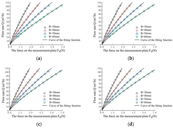 It can be initially obtained using the method of dimensional analysis []. In the formula, Q is the flow rate of the channel cross section; C is the coefficient related to the hydraulic radius of the cross section, the dynamic viscosity coefficient of the water, the width of the measurement plate, and the slope of the channel, which can be obtained by experimental fitting; FR is the force on the surface of the measurement plate. Through numerical simulation, the force on the plate surface FR and the flow rate Q in the channel can be derived, and Matlab is used to fit the two. The fitting results are shown in Figure 9, and the specific formulas are shown in Table 2.