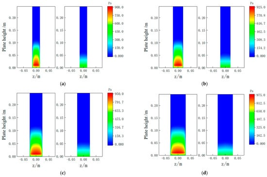 Distribution of the pressure on the surface of the measurement plate: (a) B = 30 mm; (b) B = 40 mm; (c) B = 50 mm; (d) B = 60 mm.