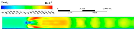 Figure 11 shows the flow velocity distribution on the surface of the water in the channel during flow measurement of the spring-plate flow measurement device. It can be seen that the upstream velocity distribution of the spring-plate flow measurement device is relatively uniform, and the velocity is small. As it gets closer to the plate, the flow velocity decreases at the middle line of the channel, and the velocity decreases to 0 at the front of the plate. Water on both sides of the flow separates from the measurement plate as it passes through the plate, and the velocity increases continuously and reaches a maximum at a certain distance after the measurement plate. The water flow through the measurement plate is diffused downstream of the plate, and the water flows on both sides intersect each other, forming a hydraulic jump. After the jump, the water flows continuously intersect and collide with the diffused water flow, disturbing the water flow pattern, which gradually stabilizes downstream and is restored to slow flow. There is a backflow area near the downstream surface of the measurement plate, and the flow velocity is small, close to 0.