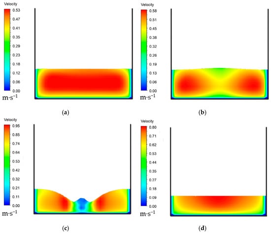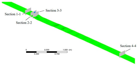 Four characteristic sections were selected in the rectangular channel to analyze its flow velocity distribution, and the selected sections are shown in Figure 12. The flow velocity distribution of the characteristic cross-sections is shown in Figure 13. From Figure 13, it can be seen that: