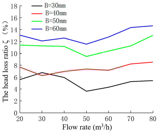 Figure 14 shows the percentage of head loss in the upstream total head generated by the spring-plate flow measurement device with different plate widths during the flow measurement in the channel. As can be seen from the figure, the head loss ratio was within 10% when the width of the plate was 30 and 40 mm, and above 10% when the width of the plate was 50 and 60 mm. For the same flow rate, the head loss ratio increased with the increase in the measurement plate width. This is because when the width of the measurement plate is small, the lateral contraction of the rectangular channel is smaller, the impact on the flow of water through the measurement plate is smaller, and the head loss ratio is also smaller. When the width of the measurement plate is large, the lateral contraction of the measurement plate on the channel is larger, the obstruction of the water flow is enhanced, intensifying the turbulence inside the water flow, energy consumption increases, and the head loss ratio will also increase. Therefore, in the actual use of the spring-plate flow measurement device, it is necessary to select an appropriate plate width for the measurement plate in order to reduce head loss.