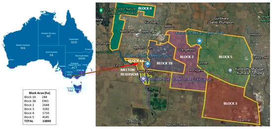The growth area boundary was provided by the local water utility “Greater Western Water”, and encompasses the entire area of urban precincts included in the Melton-Rockbank Precinct Structure Plan (PSP) (Figure 1). The entire area in PSP was included in the modelling to provide an indication of the maximum stormwater harvesting potential from this area. The urban growth area was split into six urban blocks (blocks 1–5, with block 1 further split into blocks 1A and 1B (Figure 1)). The specified urban growth blocks nominated by the water utility were included in the model at the 2040 development level, assumed as 100% urban land use. Blocks 1A and 4 were located within the natural Werribee River catchment and thus stormwater from these areas was gravity-fed into the Werribee River. Nearly 62% of the total catchment of block 1B also drained naturally to the Werribee River via Toolern Creek, whereas the remaining 38% drained to the Kororoit Creek, which is outside of the Werribee River catchment. Blocks 2, 3, and 5 were not within the natural stormwater catchment of the Werribee River and thus scenarios that included stormwater from these blocks assumed that additional stormwater runoff harvested from these blocks would be pumped into the nearby Merrimu Reservoir (not shown) based on onsite treatment level. The vision for this stormwater harvesting scheme investigation was to explore availability of alternative water resources for water planning of the proposed development. An assessment is required for stormwater quality and quantity from the proposed area once it is fully developed. The urban blocks were considered based on the Melton-Rockbank Precinct Structure Plan (PSP) [].