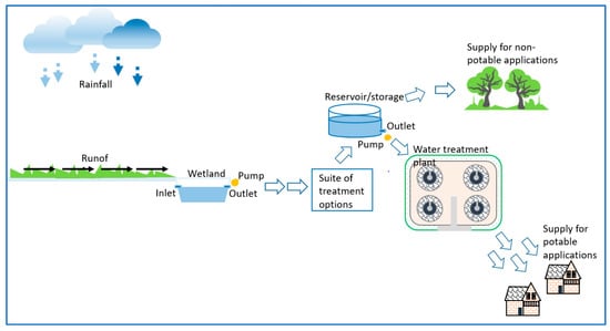 A literature review was conducted to investigate the current methodologies for the stormwater harvesting from an upcoming urban development. Various water systems and service-associated assessment methodologies are available in the literature [,,,]. These approaches mainly cover the integration of various analyses and design methods specific to urban water services. A conceptual diagram of the stormwater harvesting and potential reuse is depicted in Figure 2 below.